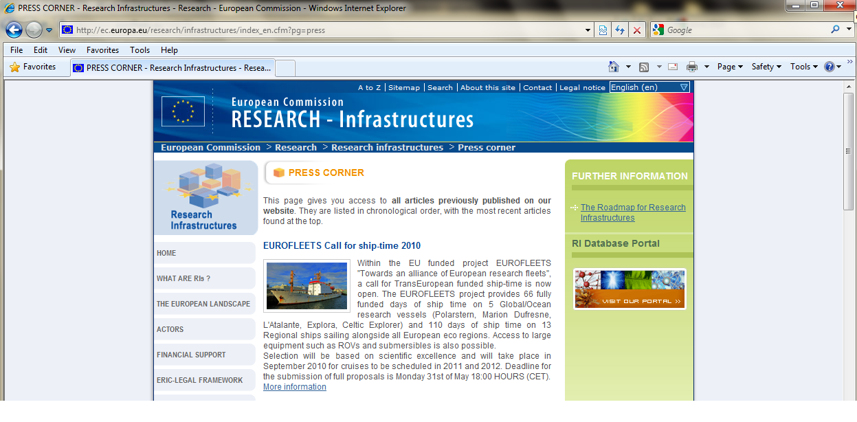 - European Commission Directorate-General Research News on EUROFLEETS Call - 11 March 2010