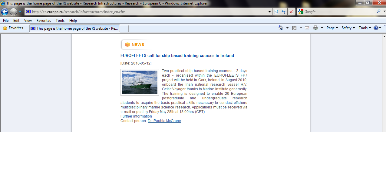 - European Commission Directorate-General Research News on EUROFLEETS Call for Ship-based Training Courses in Ireland - 12 May2010