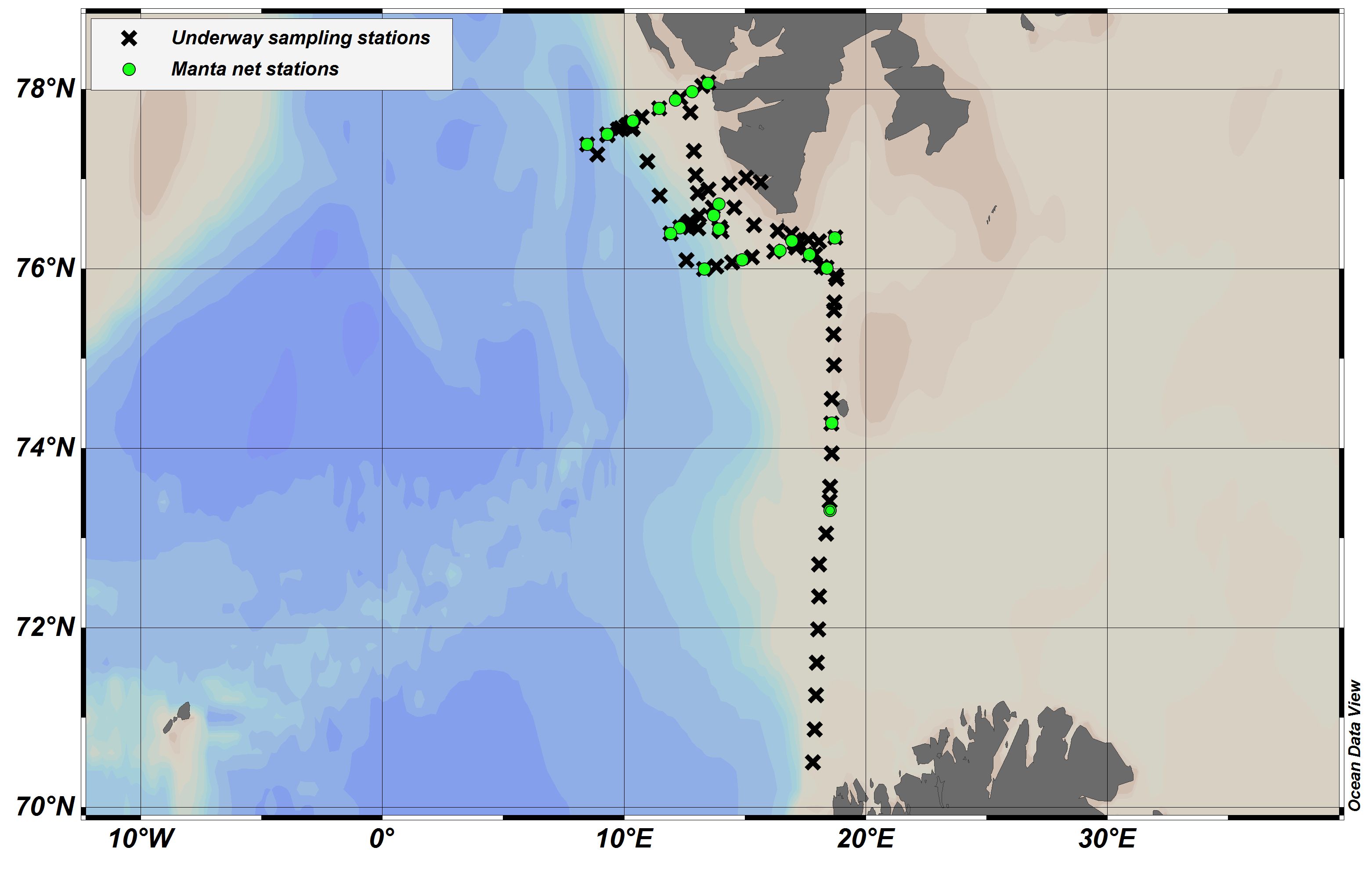 1. Identify the distribution and abundance of microplastics in polar waters during transit between Tromsø and Svalbard. 2. Compare polar fronts and currents to see if they have an effect on the distribution of microplastics. 3. Identify the presence or absence of microplastics in benthic sediment. 4. Identify changes in distribution and abundance of microplastics at different depths in the water column. 5. Compare the ratio of zooplankton to microplastics collected in surface waters.