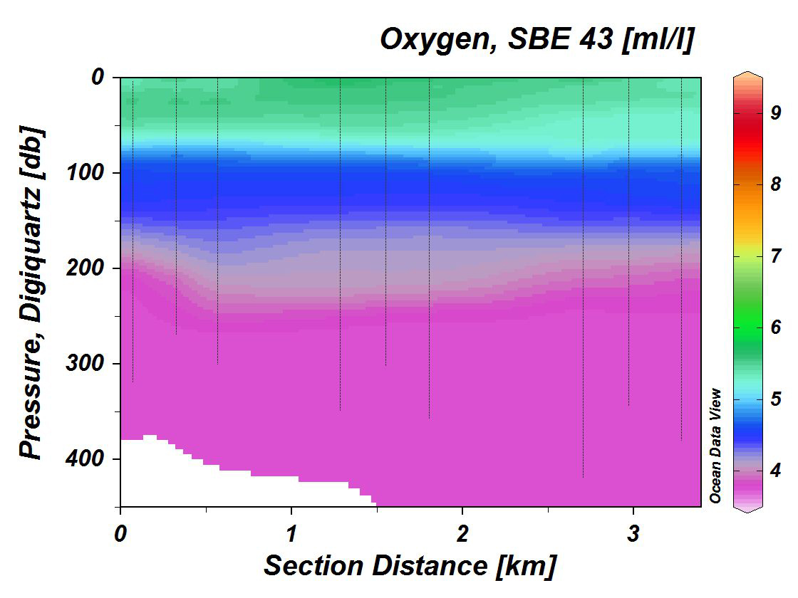 As complementary data, CTD-ADCP (Conductivity Temperature Depth - Acoustic Doppler Current Profiler) casts and seismic Sparker records were acquired along specific areas. The CTD deployed during the IRIS cruise was the Seabird SBE9. The SBE9 can measure conductivity, temperature, dissolved oxygen, fluorescence, turbidity and pressure (i.e. water depth) along the water column. The CTD-rosette was equipped with two Lowered ADCP (L-ADCP) operating at a frequency of 300 KHz: one up-looking (slave) and one down-looking (master). Compared to the standard shipboard ADCP the L-ADCP has the main advantage to acquire in-situ intensities and direction of current.