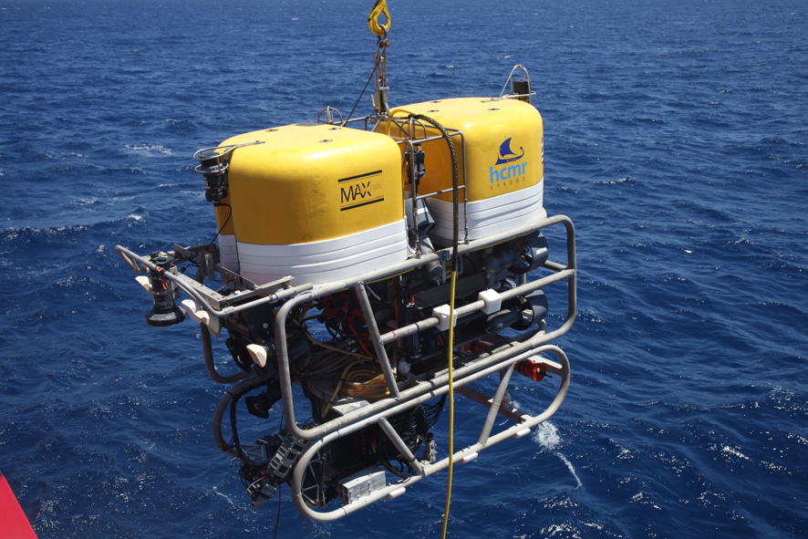 The ROV "Max Rover" is a Remotely Operated Vehicle operated by the Hellenic Centre for Marine Research (HCMR), acquired in 1998 and updated in 2002. The Max Rover has a maximum operating depth of 2000 m. It has 6 electric motors x 2.0 hp, for a resulting underwater speed of approximately 2.5 knots (fwd/rev) and 1.5 knots (vert/lat) with 160 kg bollard pull. Average transect speed on the seabed would be approximately 800 m in one hour. The ROV has several cameras, with main camera an HDTV full frame Colour Camera with zoom lens. Two parallel red lasers with 10 cm separation are used as a spatial reference. Lights are 2 x 100 W HID and 4 x 150 W Quartz. The 2 electro-hydraulic manipulators have 5 functions. The Max Rover is able to collect geological and biological samples from the seafloor and push-cores from the subseafloor. The Max Rover can also collect water samples through a 5 l Niskin bottle and acquires CTD data during the entire dive. Video graphics overlay on surface video include date, time, depth and position. Video footage during IRIS was acquired along dive tracks previously selected from the SHAKE dataset (ultra high resolution AUV bathymetry) with the function of potentially quantify specific morphometric parameters from fault scarps, assess the activity of mapped pockmarks and measure the composition, richness and diversity of the explored reefs. A total of ten dives were performed during IRIS, for a cumulative time of 2074 minutes. Six dives were mainly aimed to detect potential tectonic features (i.e. recent fault scarps, pockmarks), visualize them and collect geological and biological samples. "Geological" dives were carried out on the North-South Faults, on the Carboneras Fault, on the Al Idrissi Fault. Four dives were performed along specific geological features with the aim to visit possible reef forming habitats on top of them (Tofinho and Cabliers Banks).