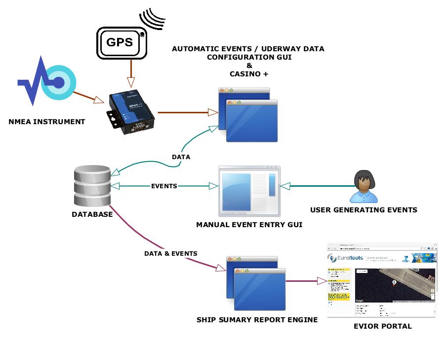 A NMEA GPS is the basic instrumentation that EARS needs to work, as it provides the information about the location where an event is generated. Additionally EARS can work with any unattended instrument that is able to generate information using the NMEA183 standard in order to provide the set of general purpose information commonly referred as "underway data". Underway data is used complementary to better understand the boundary conditions where the main data acquisition activity occurs.
