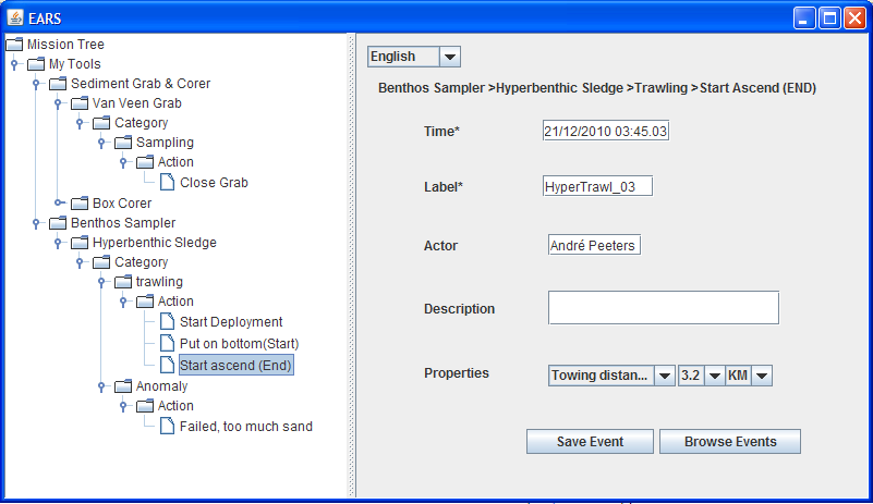 - For recording events triggered by an human interaction (any observation or annotation that any scientist or system operator wants to have recorded), EARS provides a Graphical User Interface.