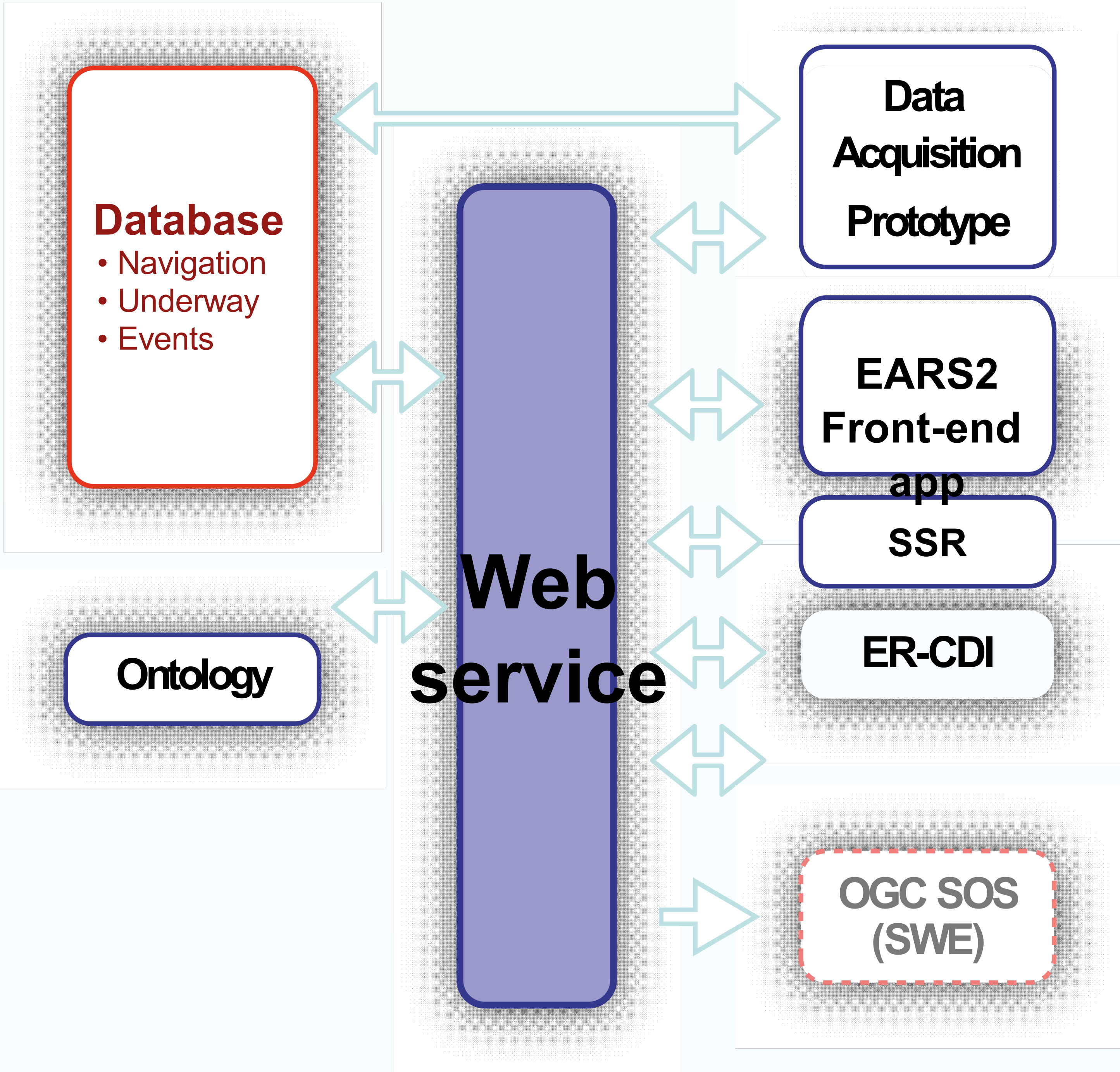 - Use of a Web Service Layer to integrate the different EARS elements. On top of a formal specification (Eurofleets Web Service White Book), a set of Web services has been implemented as a way to integrate all of EARS elements (applications, Data Acquisition modules, Databases and SSR engine). This element, also transparent to the user, will facilitate the implementation of the system in a very high variety of vessel system information infrastructures facilitating the "EARS" implantation in the European Research Fleets.