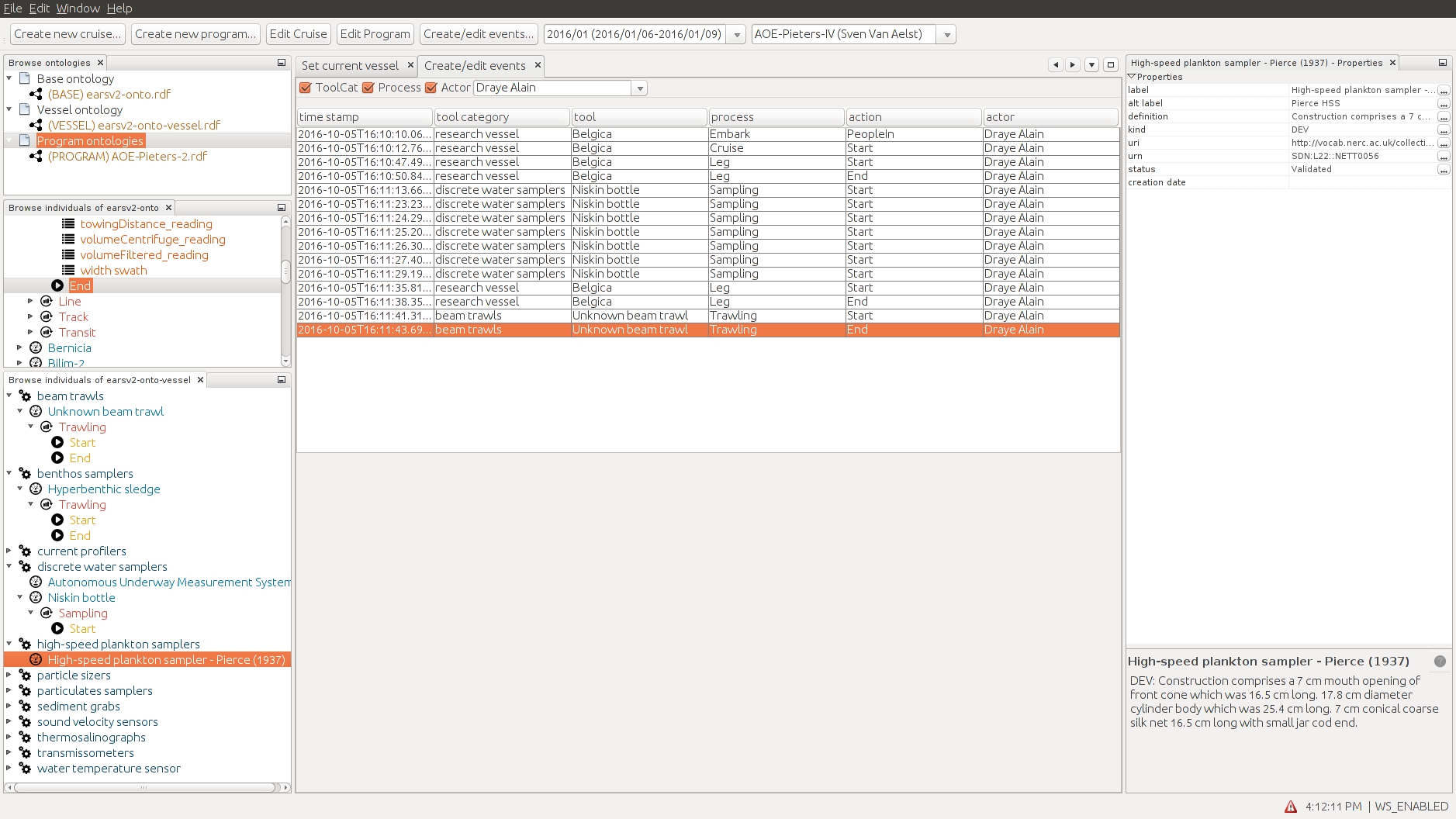 The EARS 2 Front-end application is the main source of interaction of a user with the EARS infrastructure. It enables users to create and edit cruises and scientific programs, to modify the vocabulary of event-related terms (ie. actions and processes) and to log events that happen on board. It is a new development from the EARS 1 GUI, but has a similar functionality. In order to create events and to modify the program tree or the vessel tree, the application needs to be connected to the web services that operate on the local network of the vessel.