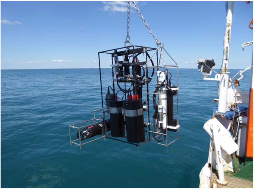 BIO-OPT-2016 ensured the execution of 54 comprehensive measurement stations (for comparison the stations were 62 during BIO-OPT-2011 due to the smaller sampling region and a higher optical complexity of water suggesting the execution of sampling stations al closer distances). Bio‐optical quantities such as remote sensing reflectance, diffuse attenuation coefficient, total absorption coefficient, absorption coefficient of non-pigmented particles, absorption coefficient of colored dissolved organic matter, scattering coefficient, backscattering coefficient and aerosol optical thickness were determined. Salinity and temperature measurements were also measured. In addition, water samples for the determination of pigments, phytoplankton species and total suspended matter were taken.