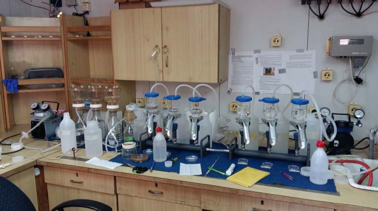 Filtration system operated to produce samples for successive laboratory analysis (e.g., pigments concentration and algal species)