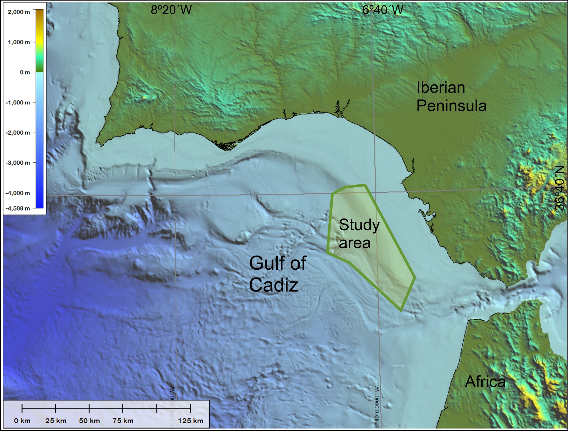 3) A mosaic of high-resolution (grid of 15 m; (Fig. 3) was obtained in the dune fields of the proximal Cadiz Contourite Channel. Two multibeam echosounders (SIMRAD EM710 and EM122) were used simultaneously. The data were processed on board.